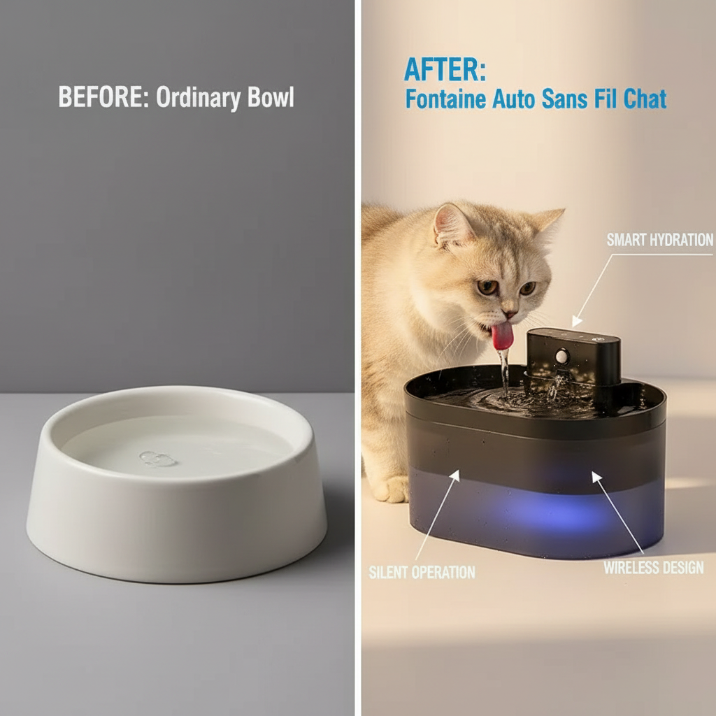 Fontaine automatique rechargeable avec capteur infrarouge. Hydratation intelligente pour vos animaux. Batterie 2600mAh longue durée. Sans fil, silencieuse et pratique.